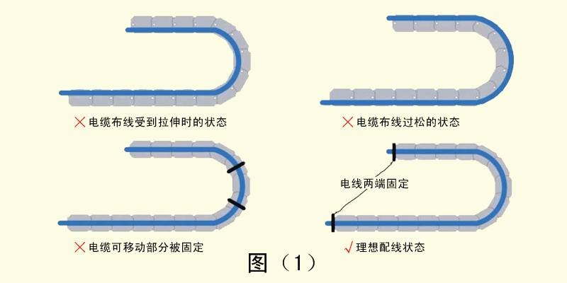 2、如果電纜在布線時愛到張力拉伸,會與拖鏈內壁產生摩擦導致護套磨損。反之如果布線過于松散,同樣會與拖鏈的內壁產生摩擦造成護套磨損,并且容易與其他電纜產生纏繞現象。電纜的布線長度應設定在剛好能通過拖鏈的中心線宜。電纜的移動部分如果被固定,會導致彎曲應力無法被分散和吸收,會在固定位置造成應力集中。電纜的固定部分應設置在拖鏈的兩端。如圖(1)