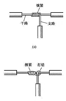 導(dǎo)線分支接頭的絕緣處理基本方法同上,T字分支接頭的包纏方向如圖21所示,走一個T字形的來回,使每根導(dǎo)線上都包纏兩層絕緣膠帶,每根導(dǎo)線都應(yīng)包纏到完好絕緣層的兩倍膠帶寬度處。